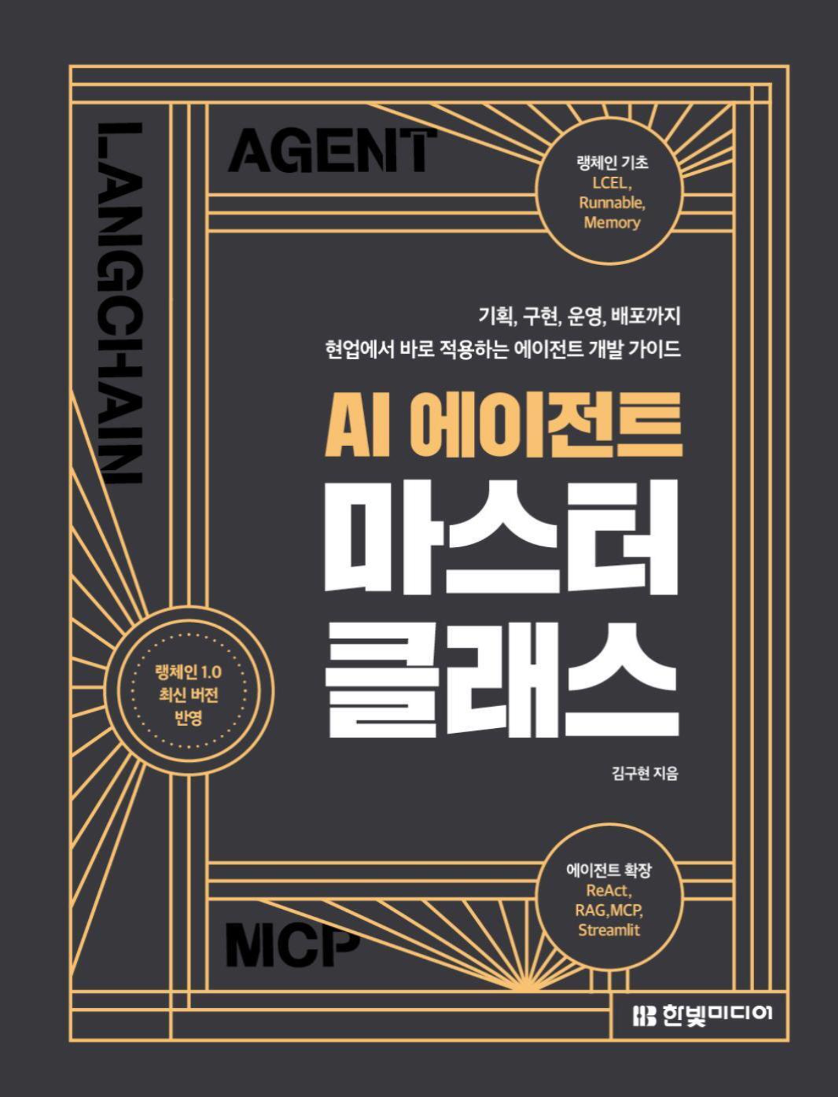 AI 에이전트 마스터 클래스는 AI 에이전트 개발이라는 큰 주제를 “랭체인 기초 → 에이전트 → RAG → MCP → 실전 프로젝트”라는 명확한 학습 경로로 정리한 책입니다. 340페이지라는 분량 안에 LangChain 1.0의 핵심 문법부터 MCP라는 최신 프로토콜까지 담아냈다는 것 자체가 상당한 밀도입니다.